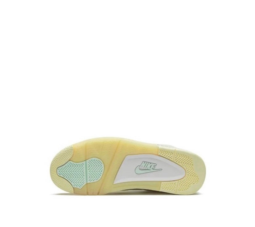 Off-White x Air Jordan 4 “Sail” is a highly desirable collaboration between Virgil Abloh’s fashion label and Jordan Brand on Michael Jordan’s fourth signature shoe. Originating as a sample during Abloh’s “Figures of Speech” exhibit in Chicago’s Museum of Contemporary Art in Fall 2019, this clean colourway received an official retail release in Summer 2020 to much fanfare. The signature “quotations” aesthetic of Abloh’s Jordan Brand collaborations underpins this Sail colored shoe, including “Air” branding printed on the midsole and “shoelace” detailing in black lettering on the laces. Translucent detailing, including the heel cup, Wings clips on the collar, and netting on the midsole and throat are all firsts for the Jordan 4. The visible Air window in the heel is surrounded by a white midsole